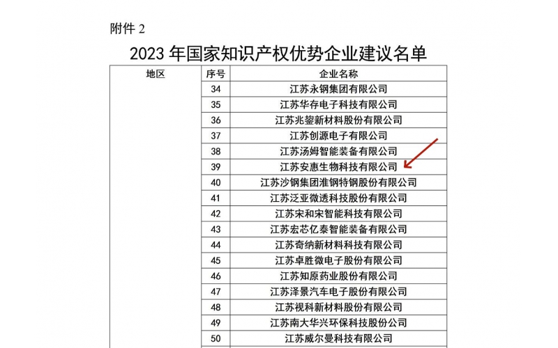 2023年11月,國家知識產(chǎn)權(quán)局公布了2023年度國家知識產(chǎn)權(quán)優(yōu)勢企業(yè)名單,江蘇安惠生物科技有限公司榜上有名。
