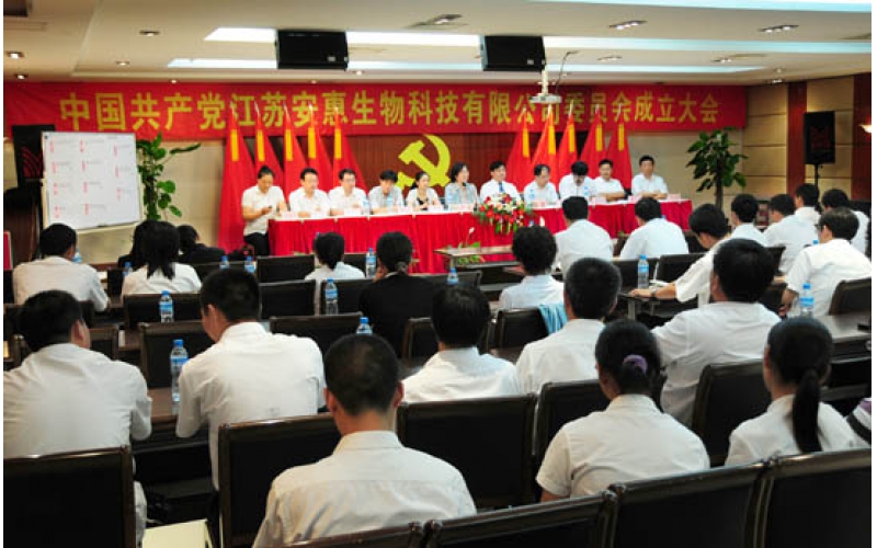 2009年6月30日,中國共產(chǎn)黨江蘇安惠生物科技有限公司委員會(huì)成立。開發(fā)區(qū)黨工委副書記、管委會(huì)副主任嚴(yán)憲,“兩新”工委書記、組織部副部長邵平,紀(jì)工委副書記王艷青等出席成立大會(huì)。