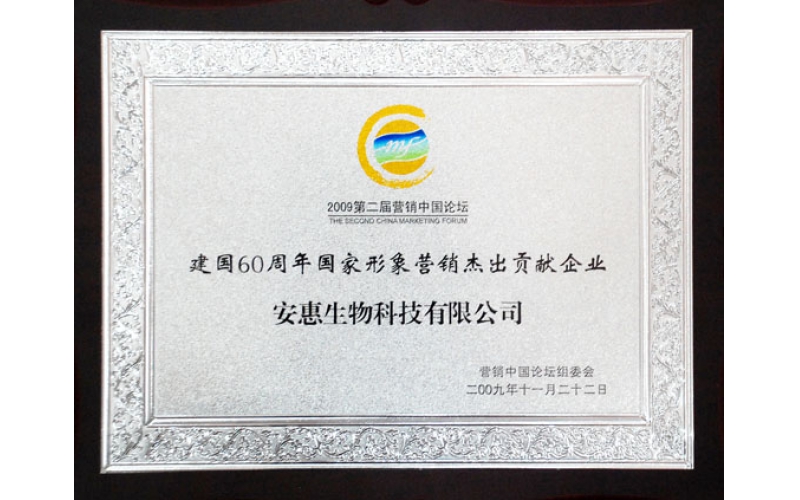 2009年11月22日,安惠公司榮獲“建國60周年國家形象營銷杰出貢獻(xiàn)企業(yè)”稱號(hào)。