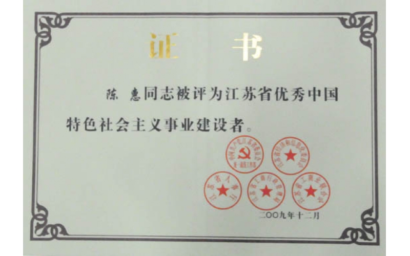 2009年12月,陳惠董事長榮獲江蘇省第四屆“優(yōu)秀中國特色社會(huì)主義事業(yè)建設(shè)者”稱號(hào)。