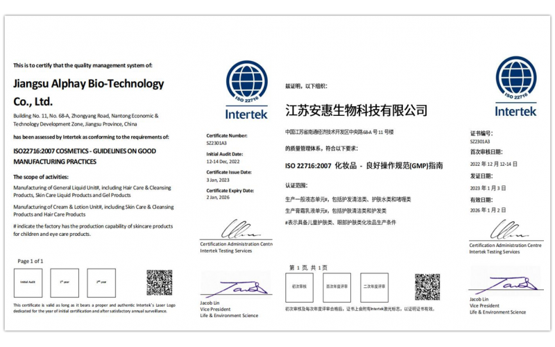 2023年1月,安惠公司化妝品生產(chǎn)系統(tǒng)順利通過認證公司Intertek的嚴格審核,獲得ISO22716質(zhì)量管理體系認證,即國際化妝品GMP認證。化妝品GMP管理系統(tǒng)的目標(biāo)是通過對生產(chǎn)流程中的每項工作、每個環(huán)節(jié)和每道工序都進行高標(biāo)準(zhǔn)的規(guī)范和要求,消除和防止產(chǎn)品在制造過程中的質(zhì)量缺陷,避免化妝品產(chǎn)品對使用者的潛在危險;GMP認證的最大優(yōu)點是證實生產(chǎn)企業(yè)的廠房、人員、設(shè)施、材料的采購和使用及產(chǎn)品制造過程控制、工廠和人員衛(wèi)生管理、質(zhì)量管理體系均達到了世界先進水平。