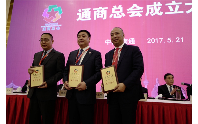 2017年5月21日下午,通商總會第一次會員代表大會隆重召開。會議通過了通商總會章程,選舉產(chǎn)生了通商總會執(zhí)行會長、副會長和理事。安惠公司董事長陳惠與其他兩人當(dāng)選為執(zhí)行會長,南通市委副書記、市政府市長韓立明為他們授牌。